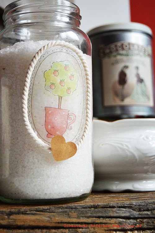 Transfer tratado con barniz mate.Y para terminar de decorar mi bote de cristal y rematar el contorno, le ha colocado una pequeña cuerda de algodón.