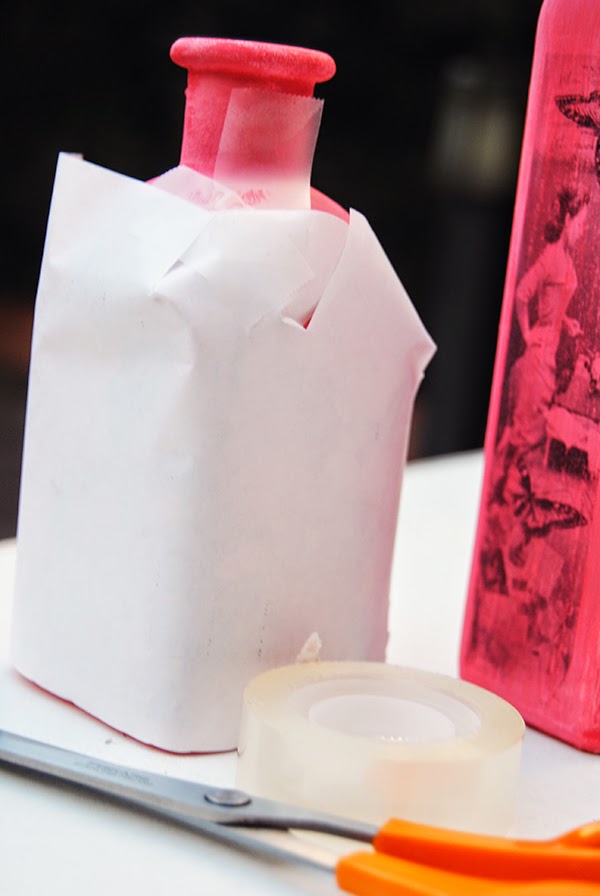 Hice varias composiciones con el ordenador y en vez de imprimirlas en un folio normal usé papel especial para transfer. La diferencia es que este último no absorve la tinta, se queda en la superficie. De este forma, cuando colocamos el papel de tranfer sobre un objeto todo el dibujo se queda impreso. Para poder hacerlo, cortamos la parte de la hoja donde se encuentra nuestra imagen. La pegamos sobre la botella. La cara donde está la tinta, evidentemente, pegada al cristal.