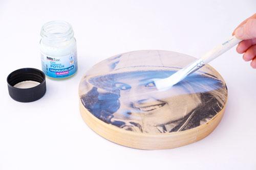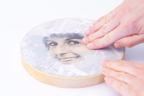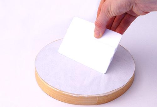 Una vez tengamos la foto impregnada del producto, ponemos la imagen sobre la madera. Debemos de poner la parte de la imagen mirando hacia la madera. Es decir de manera que se pegue la imagen en la madera. Con mucho cuidado pasamos la paleta o tarjeta por encima para sacar las bolsas de aire que se puedan haber formado.