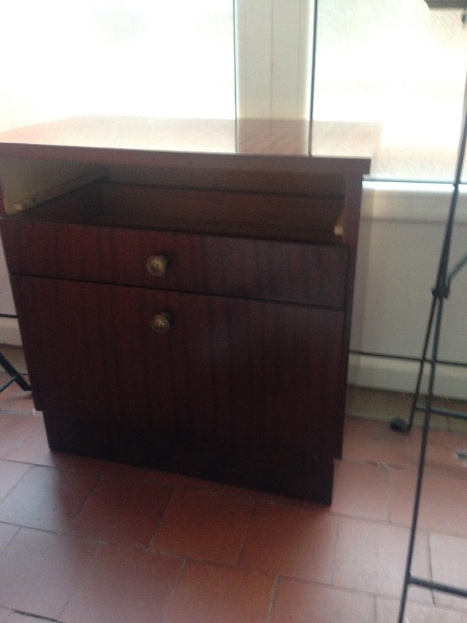Mis padres tenían un dormitorio aproximadamente del año 1975, del cual ya sólo quedaba una mesita. La estética de la mesita es muy lineal, lo cual me gustaba mucho, pero la chapa y el color era muy de la época.