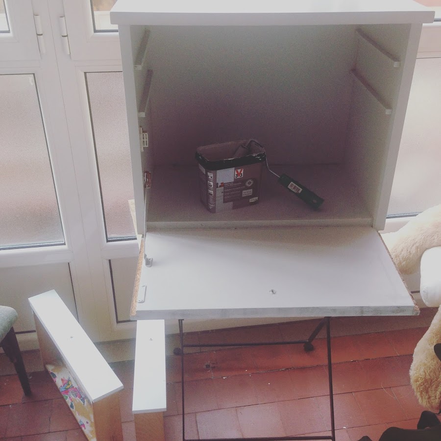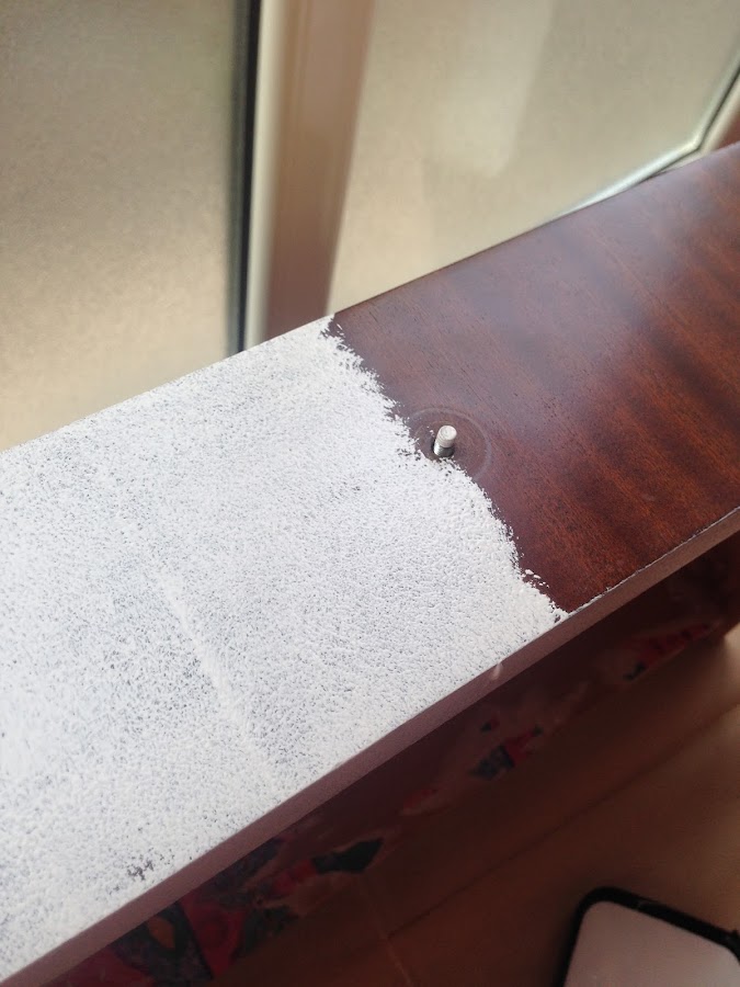 Le pasé 2 manos, suficiente para que quedase perfecto. También he pintado la parte interior de la mesita, el fondo del mueble ya que al abrirlo se ve y como el color era muy diferente y me sobraba pintura pues la utilicé al máximo.