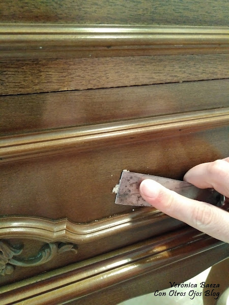 Para comenzar tapé con masilla para madera los agujeros de los antiguos tiradores y los pequeños desperfectos que tenía la mesilla.