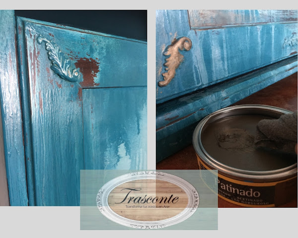 Con un trapo mojado en agua fui eliminando los excesos de pintura en ciertas partes del mueble para envejecerlo como en Las molduras.