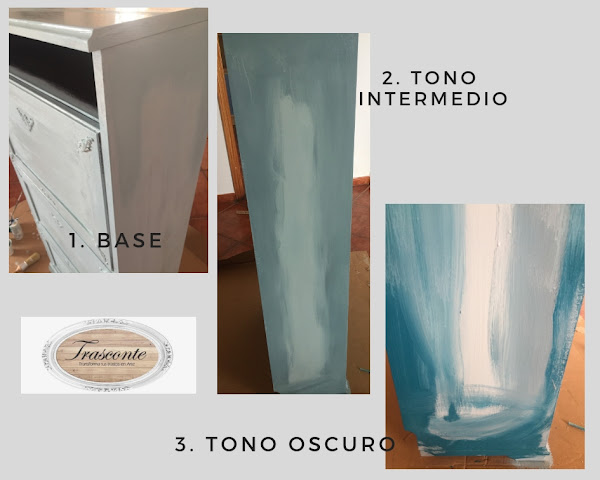 Yo tengo este tono de gris invernal que es pintura a la Tiza, Partiendo De esa pintura realicé tres tonos, que son los que vamos a utilizar. A uno le añadí un poco de tinte azul y le di a todo el mueble una primera mano de pintura de ese tono.