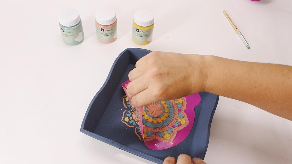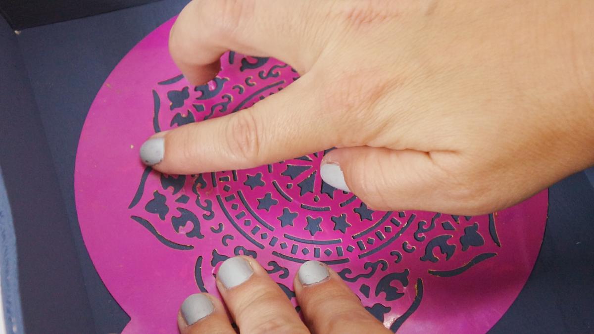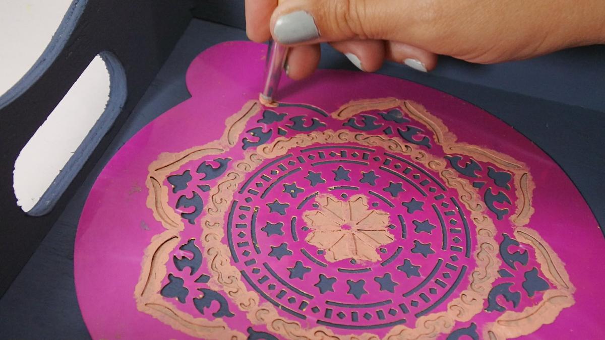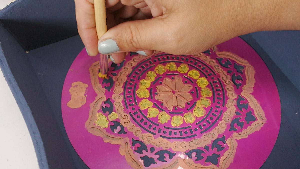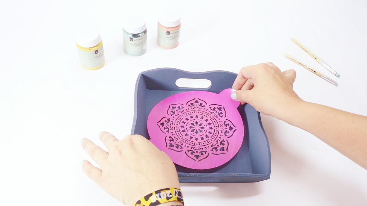 Una vez seca la bandeja, podemos comenzar a pintar el mandala. Para ello, fijamos correctamente el stencil. Lo podemos hacer con cinta de carrocero, o con adhesivo removible. En el caso de plantillas como esta, con tanto detalle, yo os recomiedo el adhesivo removible ya que fija perfectamente el stencil.