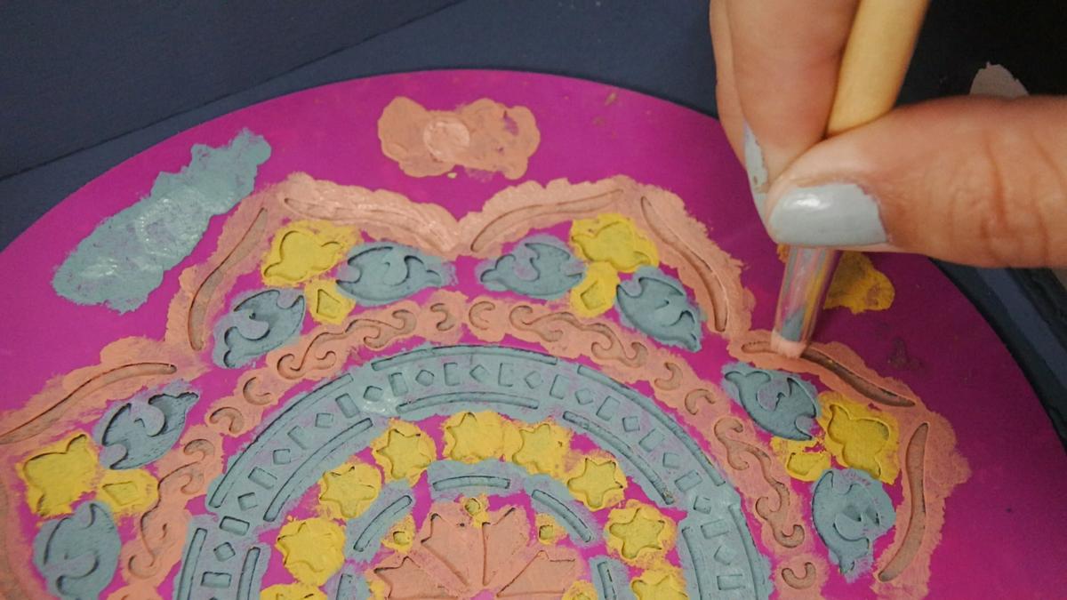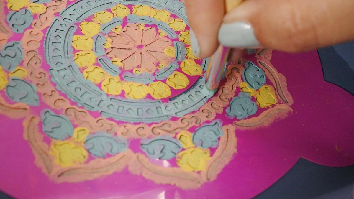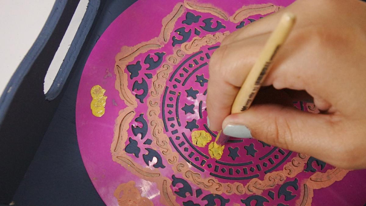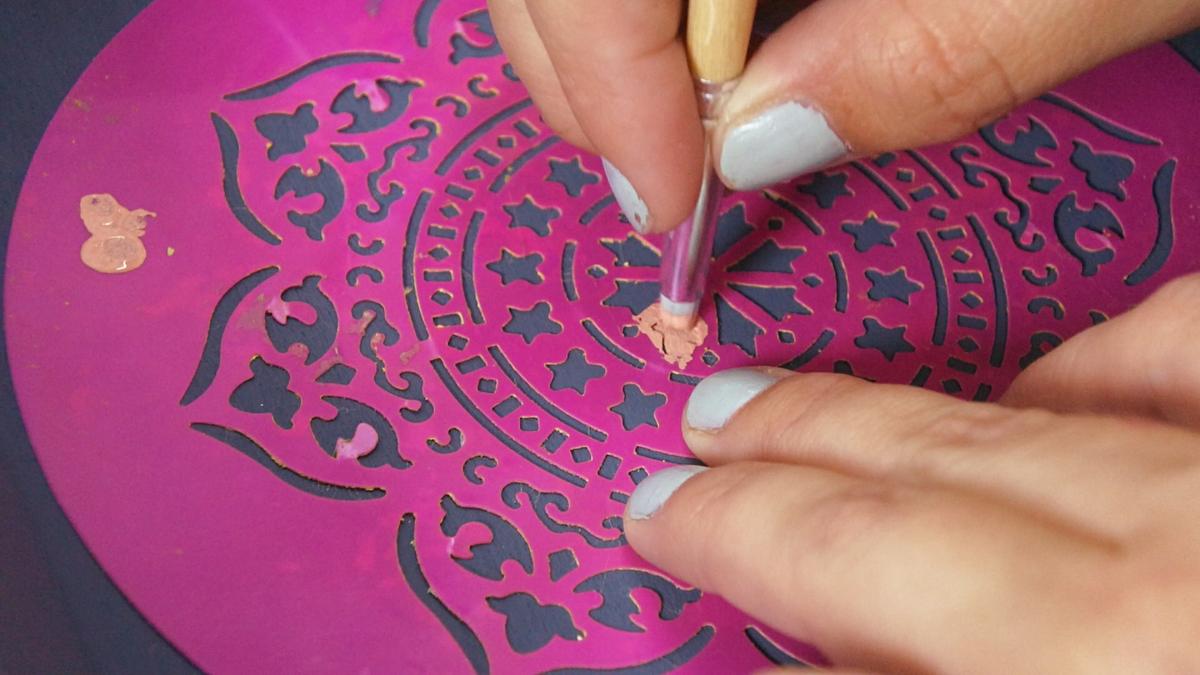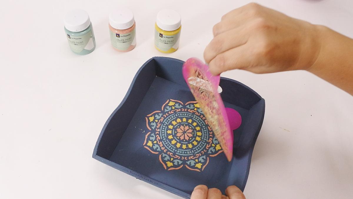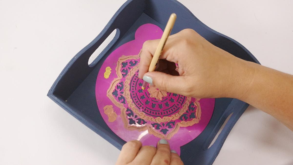Una vez seca la bandeja, podemos comenzar a pintar el mandala. Para ello, fijamos correctamente el stencil. Lo podemos hacer con cinta de carrocero, o con adhesivo removible. En el caso de plantillas como esta, con tanto detalle, yo os recomiedo el adhesivo removible ya que fija perfectamente el stencil.