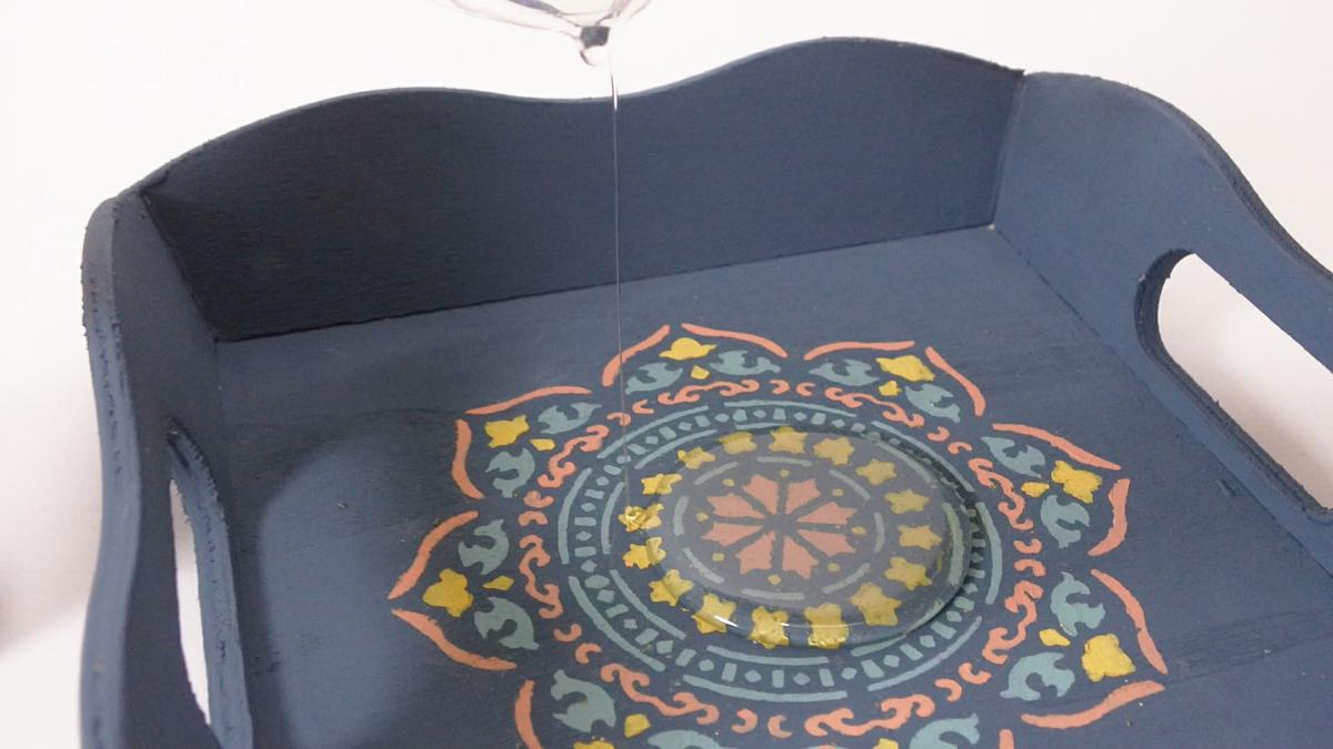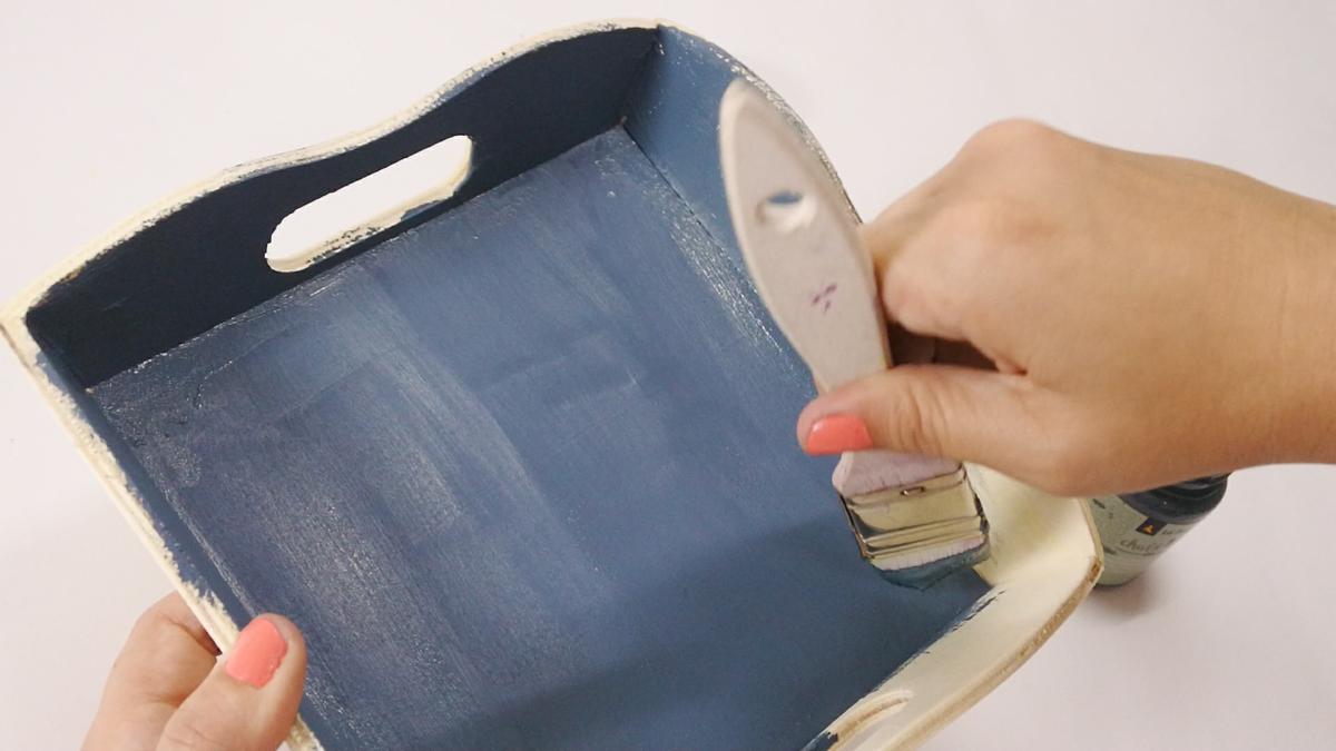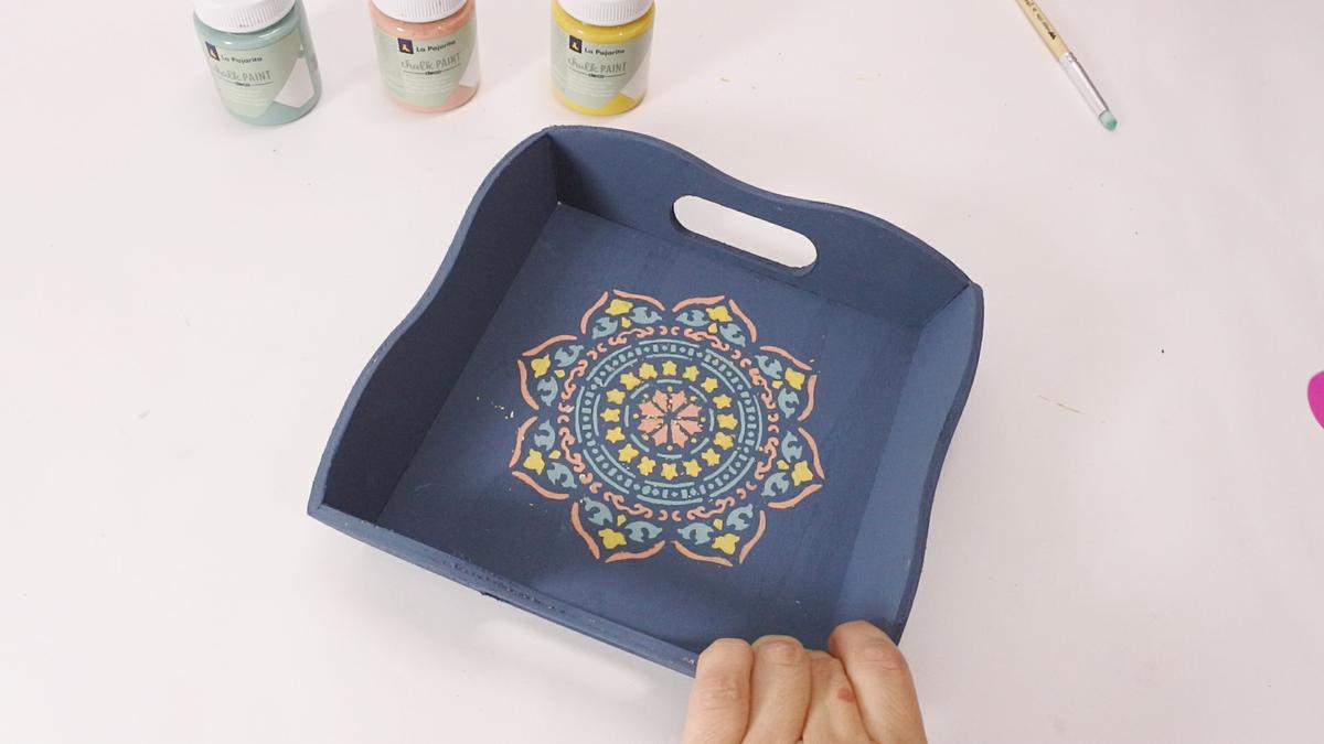 El primer paso ha sido pintar toda la bandeja en un solo color, para así después darle todo el protagonismo al mandala, el color que nosotros hemos elegido es el Midnight blue. Con una sola capa de pintura ha quedado perfecto.