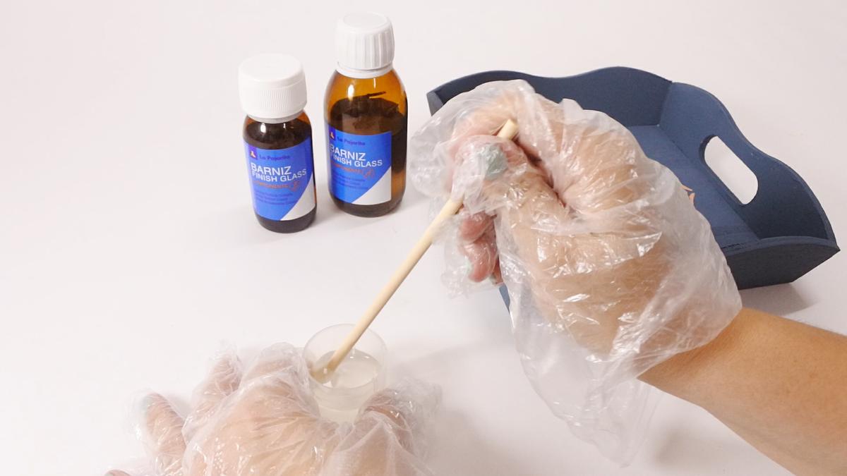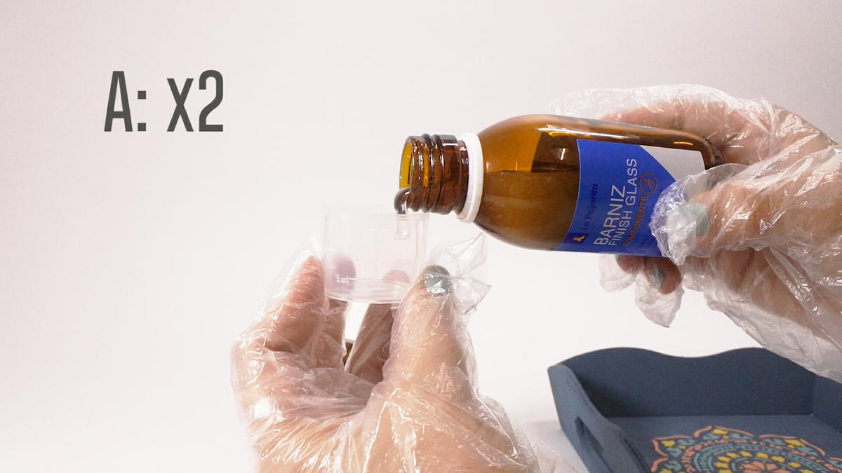 Una vez hemos añadido los dos componentes al vaso medidor, lo mezclamos bien con un palito de madera y lo vertemos sobre la superficie, en nuestro caso el fondo de la bandeja de madera.