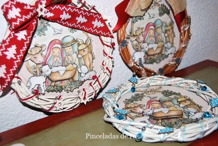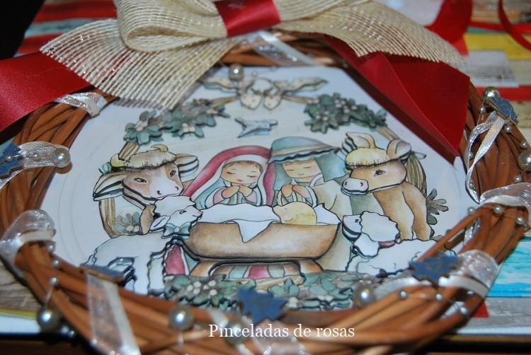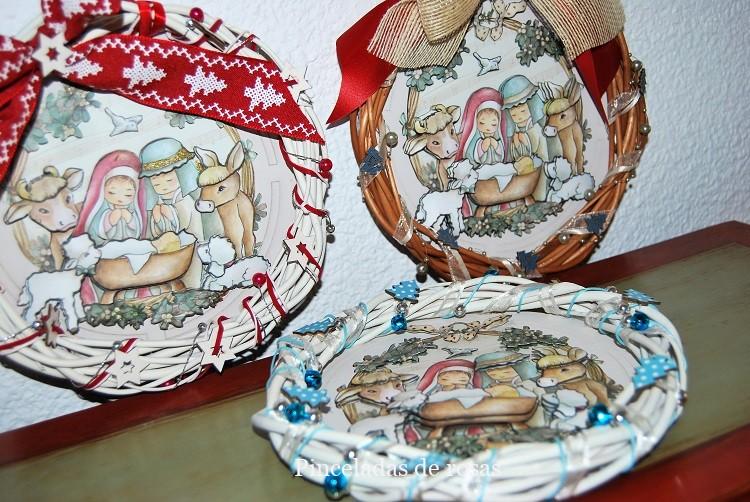 Realizadas en papel que ya nos viene decorado con figuras Navideñas, para estas coronas he elegido El Misterio de la Navidad en papel scrap ( papel tipo cartulina), tan sencillo con recortar las figuras y montar en relieve dándole fondo y realce tanto a las figuras como la escena que representada.