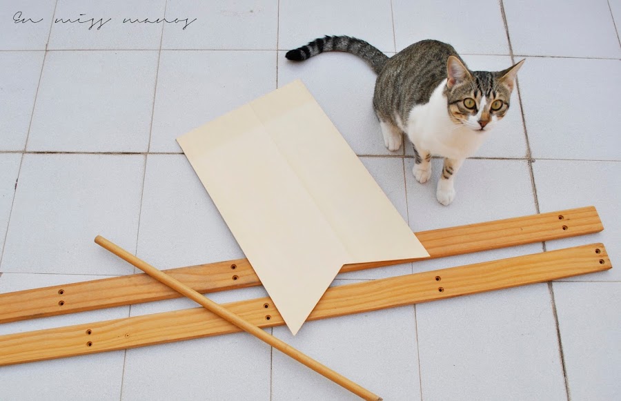 Sólo me hicieron falta dos listones largos y planos, de unos 8cm de ancho, un tablero de contrachapado y una varilla redonda. (La gata no es necesaria, pero oye, hace compañía durante el trabajo que se agradece siempre, jajaja)