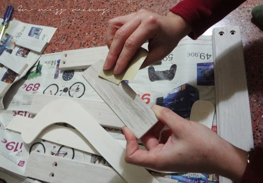 Después de cortar lijé bien todas las astillas que pudieron quedar y pinté todas con pintura blanca, sin imprimación para que quedara un efecto más desgastado.