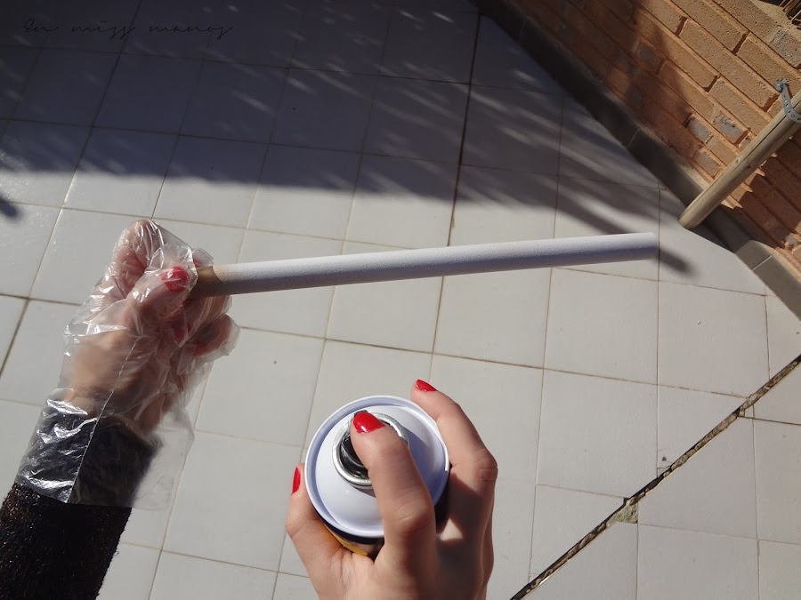 Pinté la varilla redonda con spray, habiéndole dado antes también con cera para desgastar.
