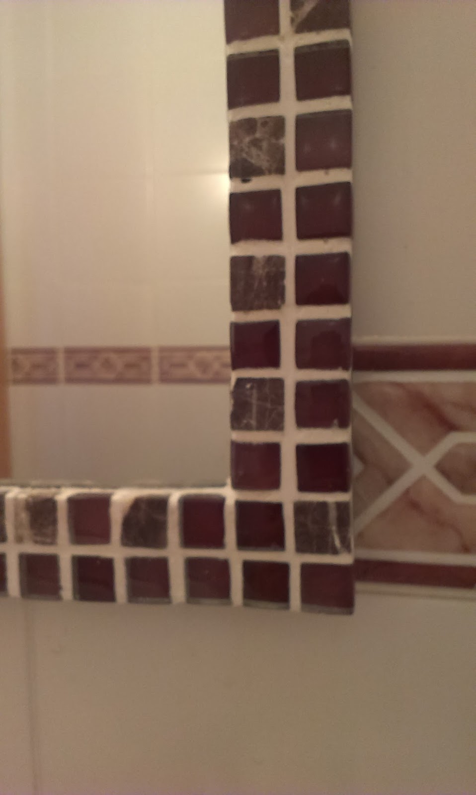 Corté las teselas en filas de a dos, el espejo no es muy grande y no quería perder demasiado. La idea era pegar las teselas como un marco al espejo y luego rellenar las juntas entre ellas.