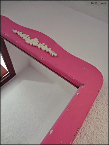 Después de pintarlo de rosa y desgastarlo por los bordes (esta vez mejor que la anterior), se me encendió la bombilla y me acordé de un relieve de rosas que tenía guardado y que cogí de una cajonera que ví en el contenedor rota.