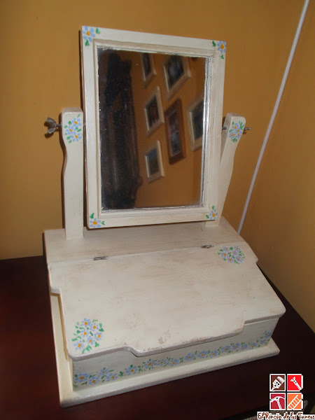 Una vez seca la pintura, pasar un paño con un poco de betún de judea mezclado con cera por algunas zonas del tocador para oscurecer los bordes y grietas.