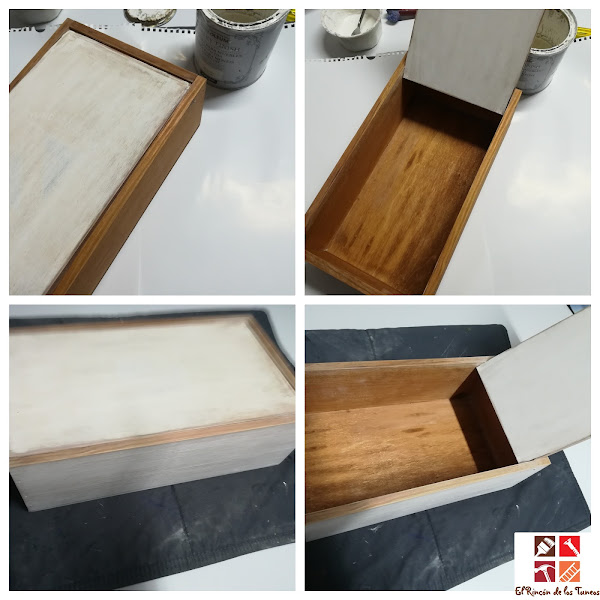 Lo primero fue pintar la caja utilizando pintura a la tiza blanco roto, dos manos y entre una y otra lijé suavemente para que se viese la veta de la madera, y dejando algunas zonas por pintar, como los bordes y el interior de la caja de su color natural.
