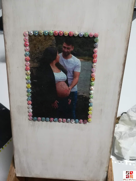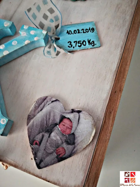 Pegué con las pistola de silicona caliente al igual que una placa que añadí pintando su peso y fecha de nacimiento y una foto en un corazón de madera.