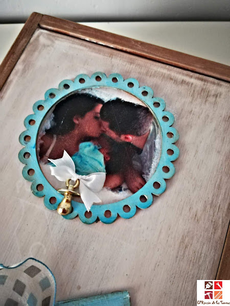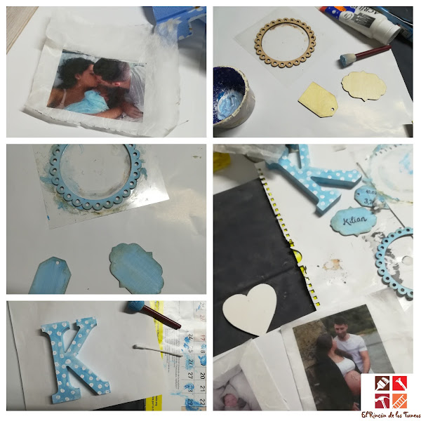 Lo siguiente fue decorar la tapa por dentro y por fuera, para ello saqué en la impresora varias fotos de mi sobrina y Kilian, haciendo decoupage con ellas, pinté varias piezas de madera en tonos azules y fue decorándola según me iba cuadrando .