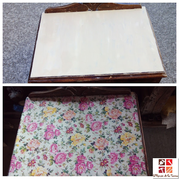 Pinté con acrílica blanca la base de la mesilla , ya que al poner la servilleta que había elegido le iba a dar más luminosidad.