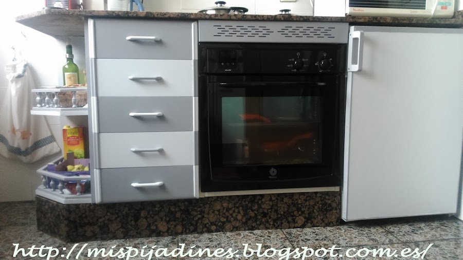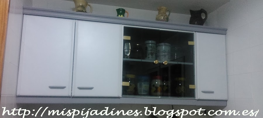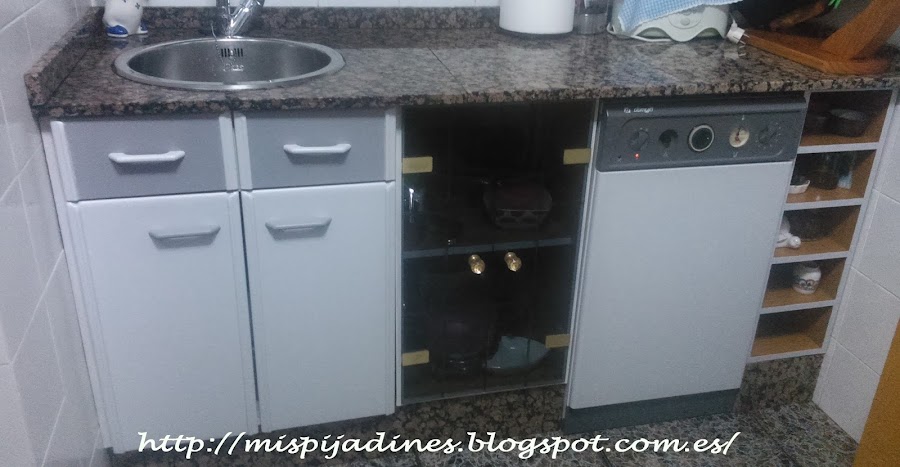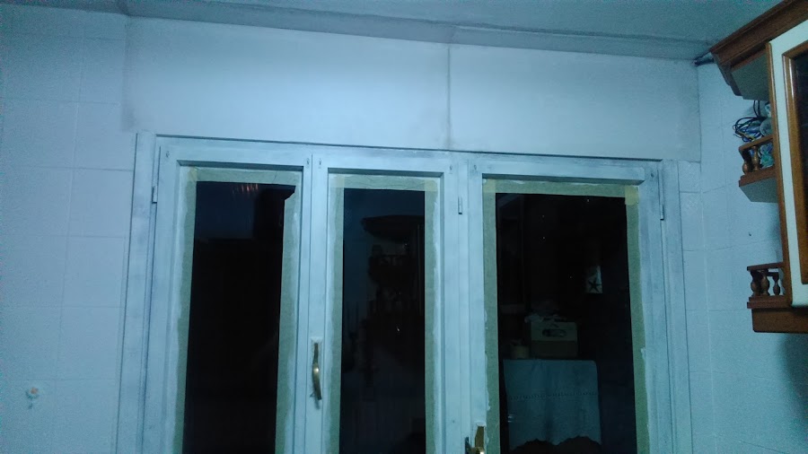 La ventana y puerta de salir a la terraza lo pinte en blanco roto, quité la persiana y su cajón lo cual ha dado mas amplitud a la cocina, y sustituí las cortinas por unos vinilos que también le da mas claridad..