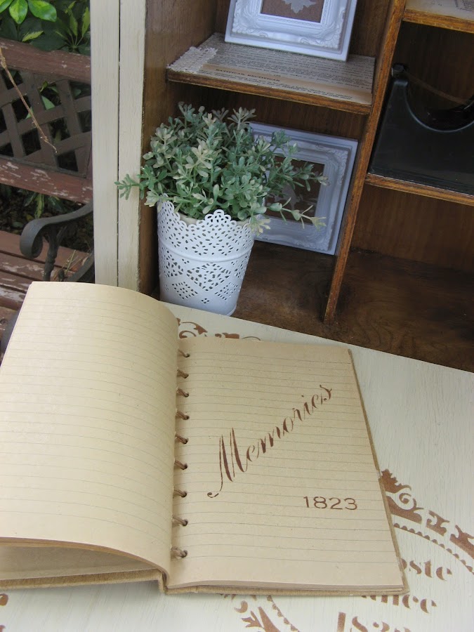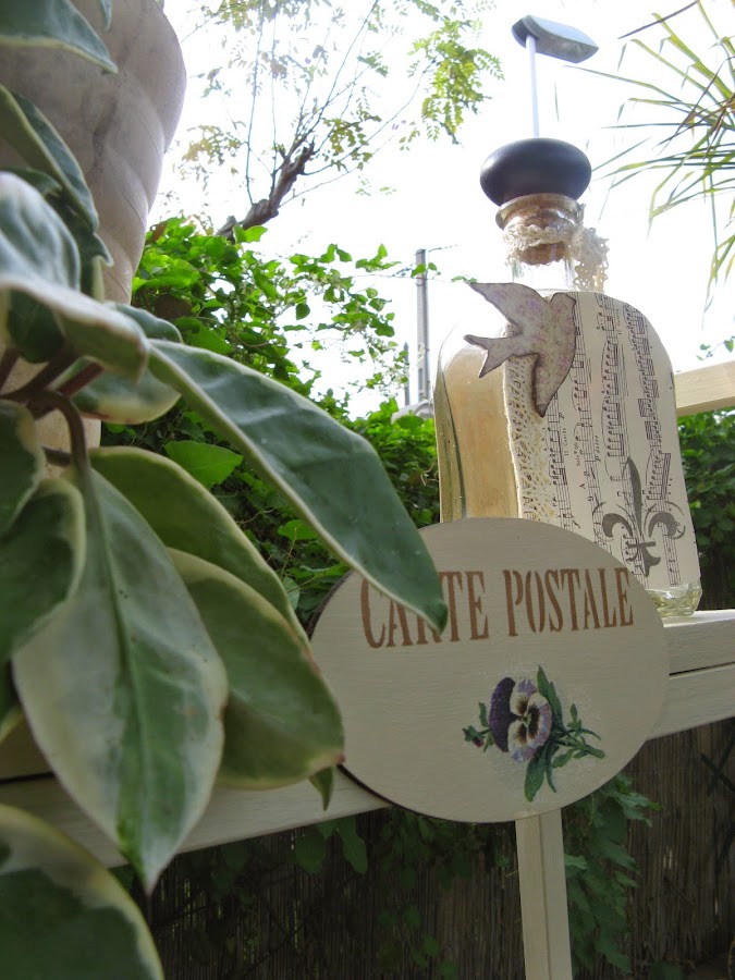 Arriba una plaquita de madera con estarcido con este stencil y una flor de la misma servilleta