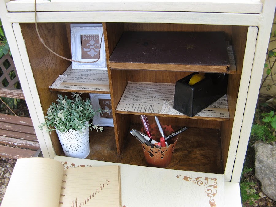 Primero forré la parte del interior por aclararla visualmente. Con cola fuí pegando las hojas y luego presionando con un paño por encima. Al principio queda fatal...parece que hay arrugas por todas partes, pero hay que dejarlo secar completamente y mejora muchisimo.