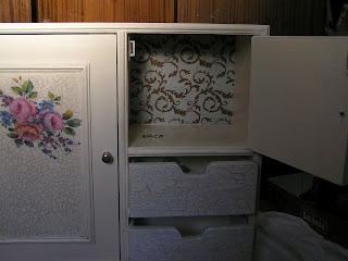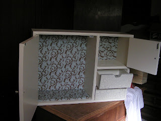 Empapelé el mueble con un papel adhesivo en tonos marrones y grises que le iba muy bien, cambié los tiradores y dentro le puse una pequeña balda para poder colocar más cosas