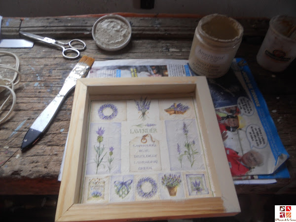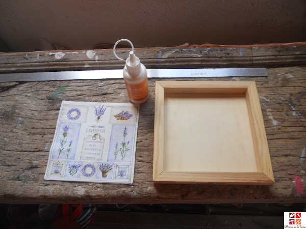 Empecé al revés de como suelo hacerlo, en el cuadro tal cual veis le dí con cola decoupage, puse la servi que no tuve ni que cortar ni lijar ni nada, era la medida exacta.