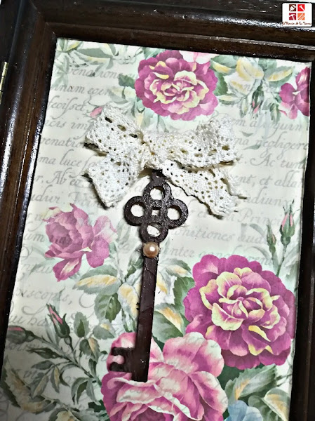 Lo adorné con una llave de madera que pinté con acrílica marrón y envejecí con una patina, pegué una perla adhesiva, y por último puse un lazo que hice con una puntilla