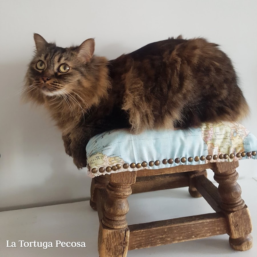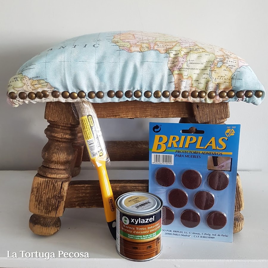 Colocado zona mullida donde la zona de sentarse y forrado con tela de loneta resistente de mapamundi. Remetazo con tachuelas antiguas que tenía ya la butaquita. Le da un toque vintage.
