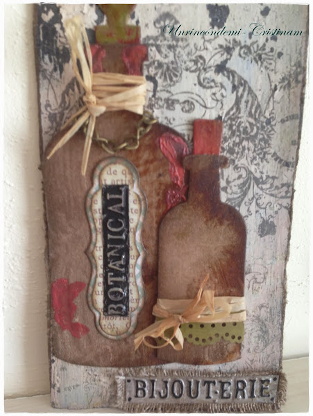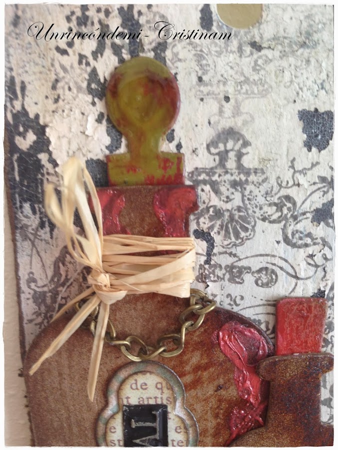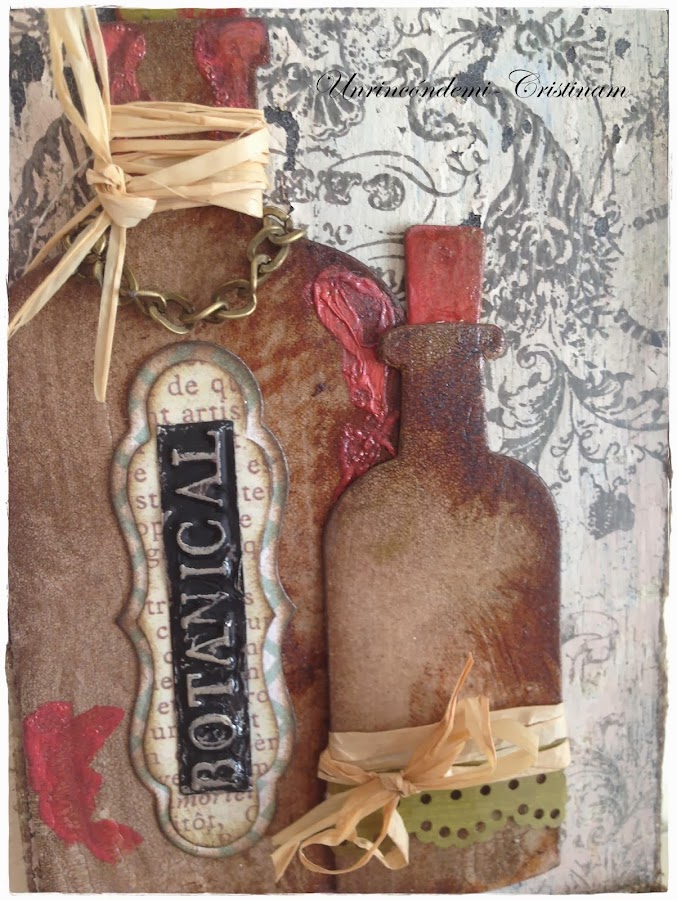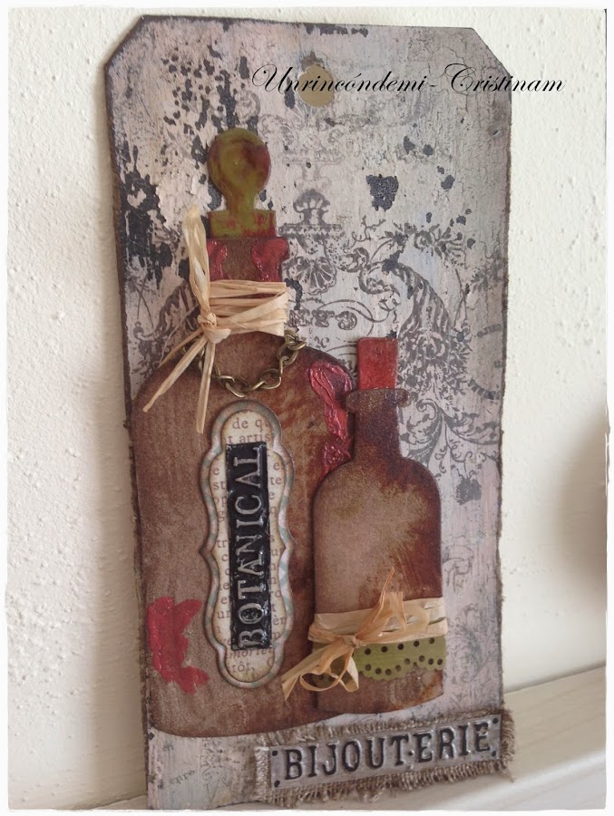 Ya sólo queda decorar con troqueles... esto me encanta , en mi tag he usado unos troqueles botellas de Tim Holtz.