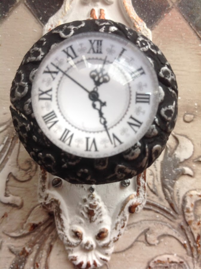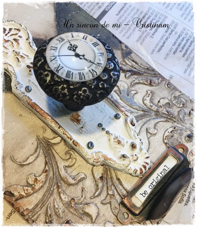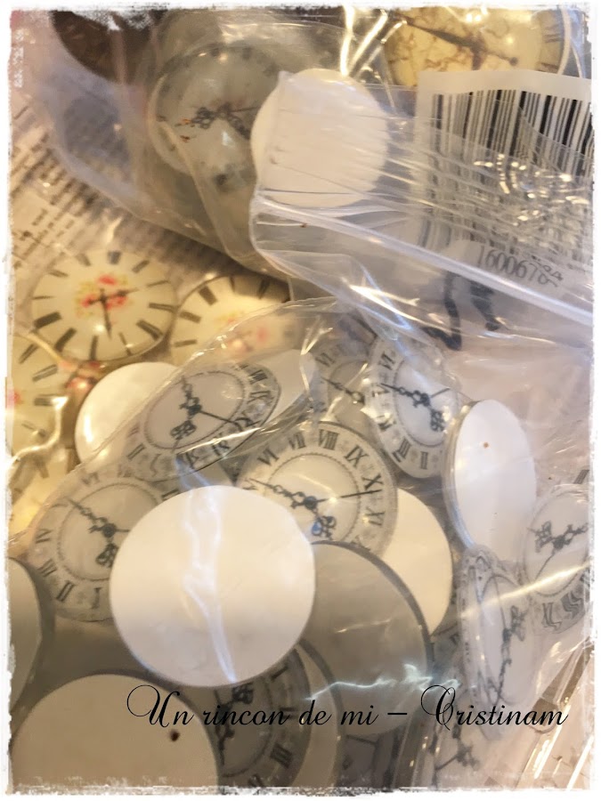 Para hacer el tirador con forma de reloj he utilizado unas piezas de cristal con un dibujo de reloj por detras.