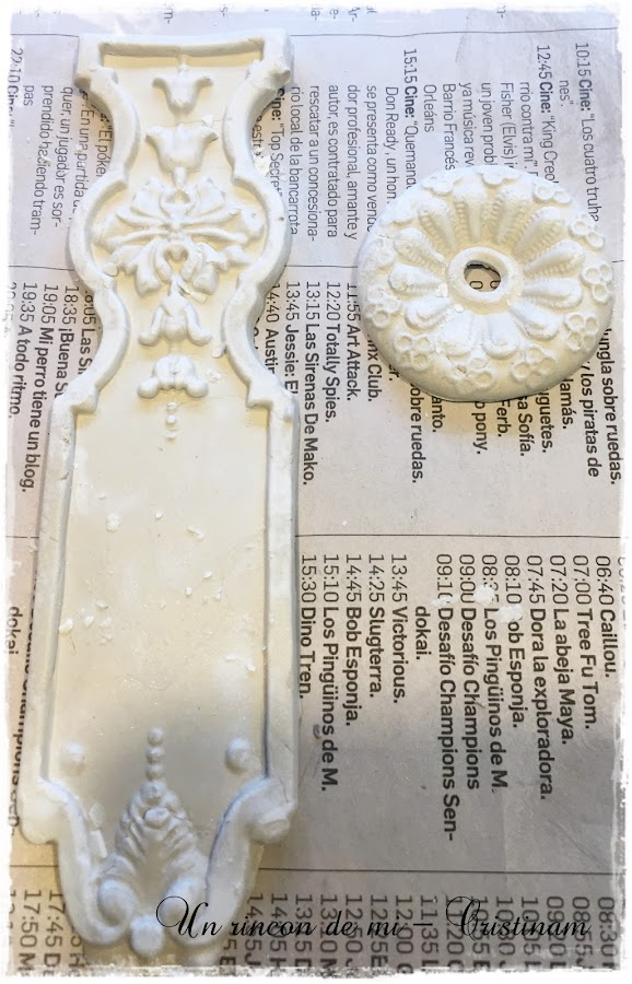 Pego la pieza del molde en el tirador con pegamento y luego lo voy adaptando a la forma del tirador con los dedos procurando no romperlo.