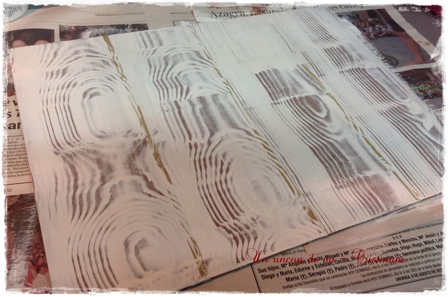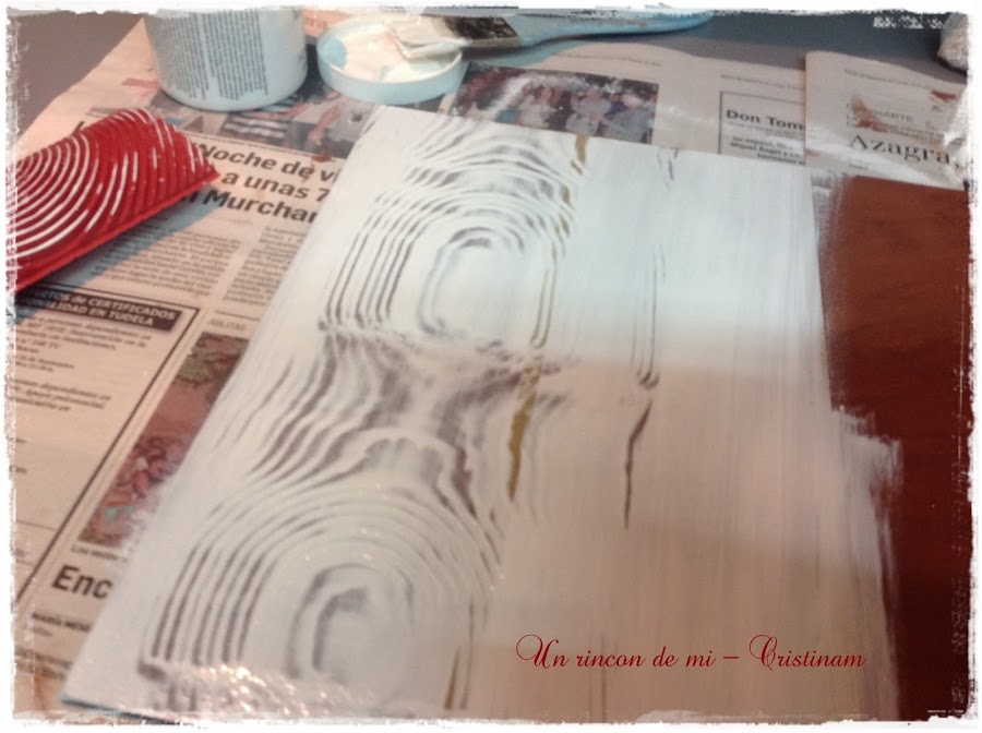 Ahora voy a usar pintura blanco y una herramienta muy útil que se llama veteador y que podéis encontrar en tiendas de pinturas .