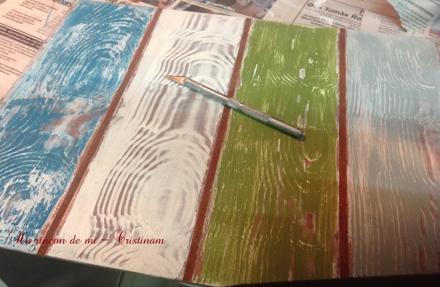 No me gustan las rayas tan perfectas así que con un cutter voy rascando y eliminando las marcas tan bien definidas.