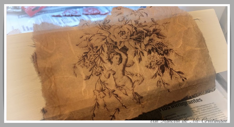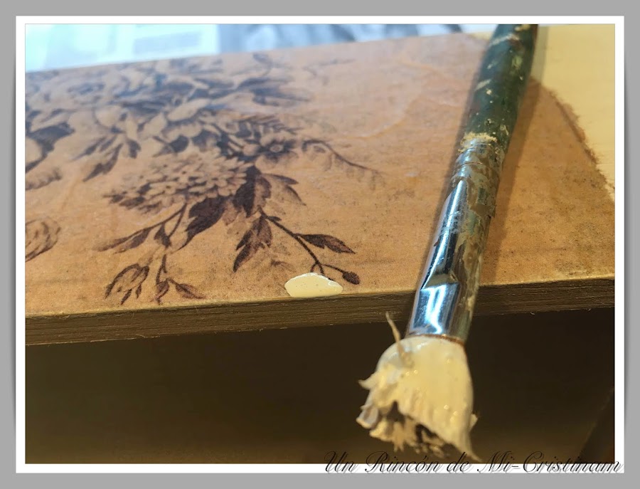 El siguiente paso es pegar el papel de arroz a la superficie,, para ello recorto sólo lo que necesito y lo adhiero con Pegamento para servilletas de la casa Cadence.