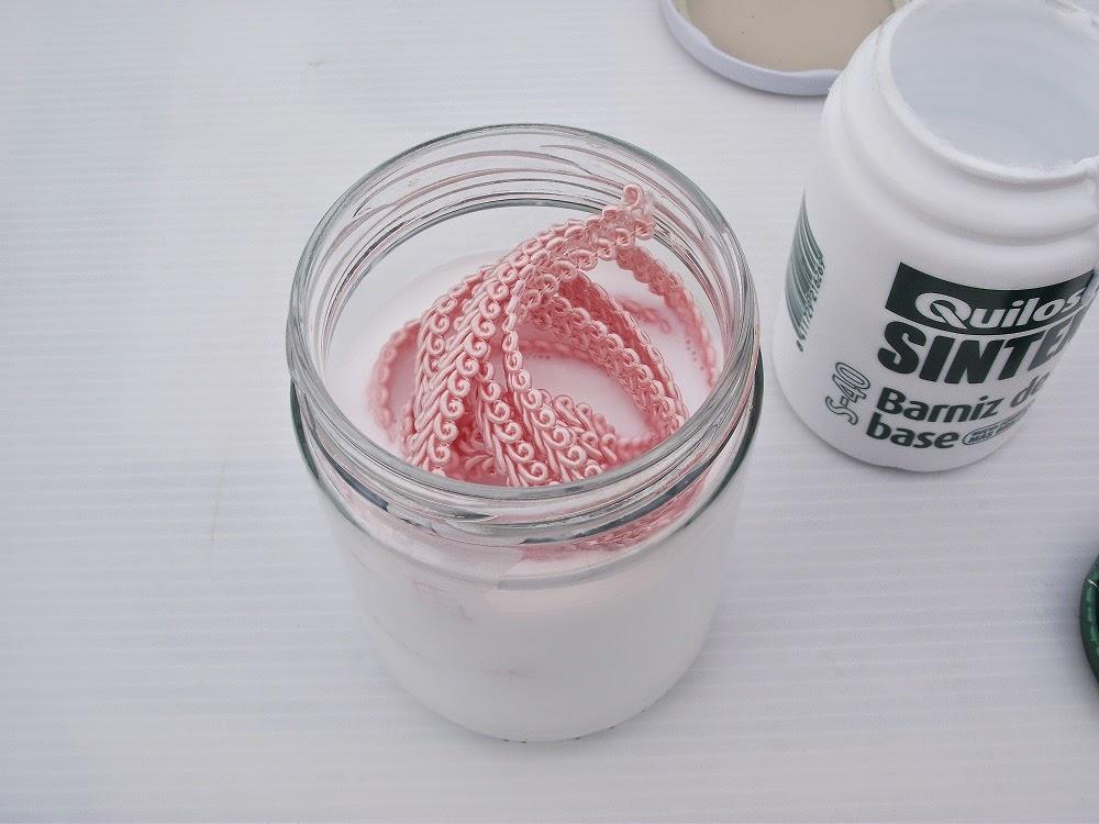 Introducimos la tela y la pasamanería en el bote y dejamos empapar durante 1/2 hora.
