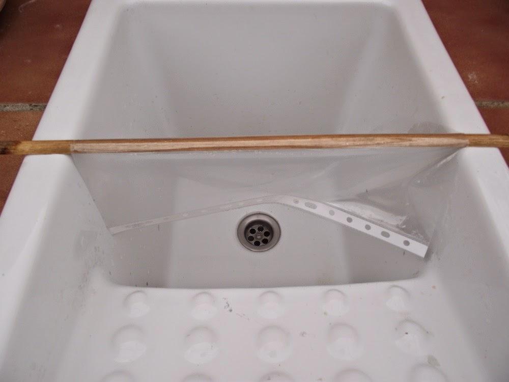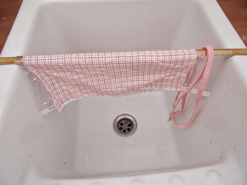 Pasado ese tiempo lo tenemos que poner a escurrir sin estrujar. Yo he colocado una varilla de madera encima de la pila de lavar y le he colocado un plástico para evitar que la madera húmeda manche la tela.