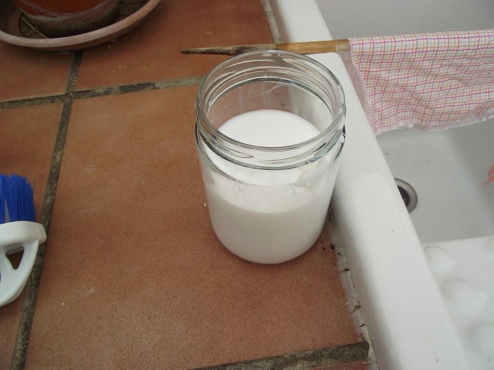 Ponemos en el bote 3 cucharadas soperas de ALKYL y añadimos 300 cc de agua. Con esta proporción la tela no queda excesivamente tiesa, pero si la necesitáis más endurecida basta con añadir menos agua.