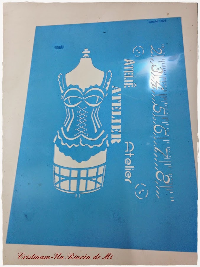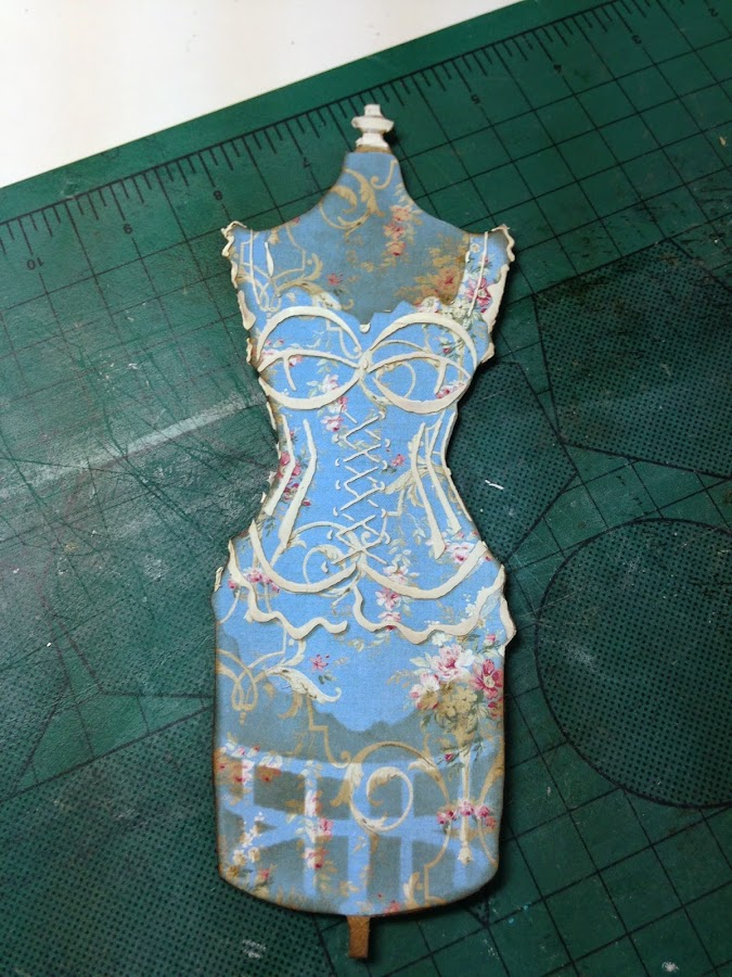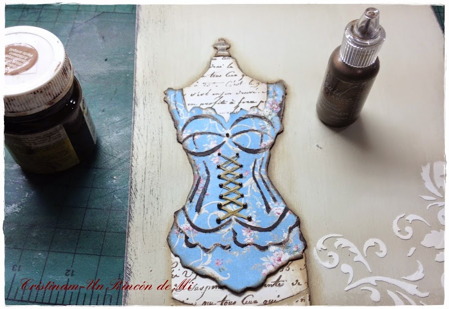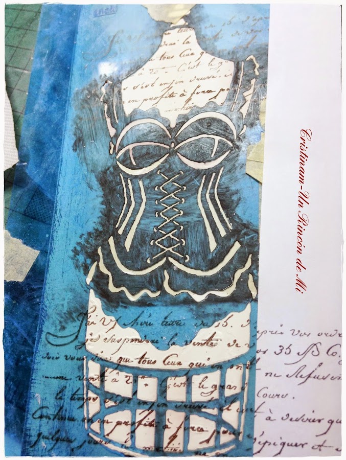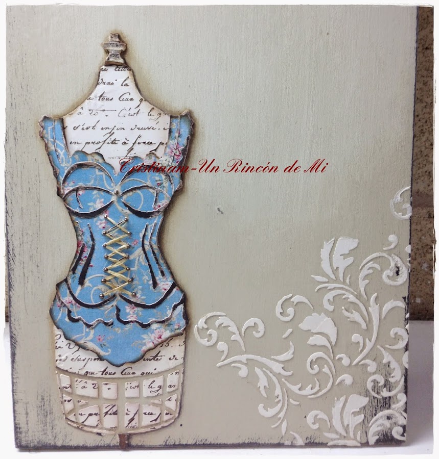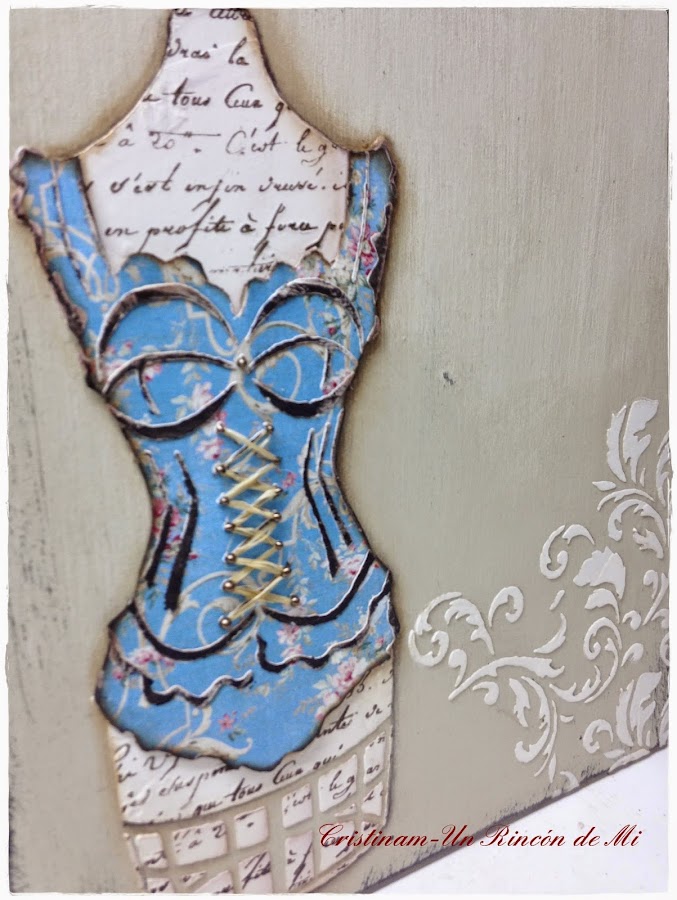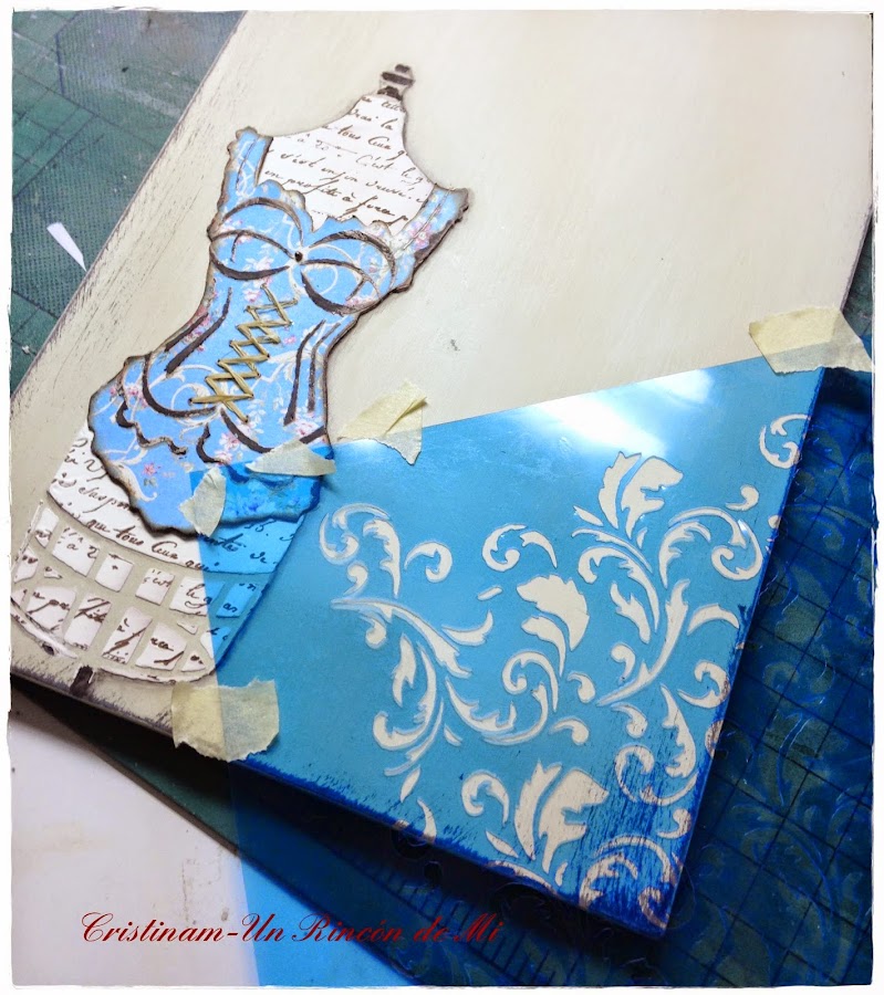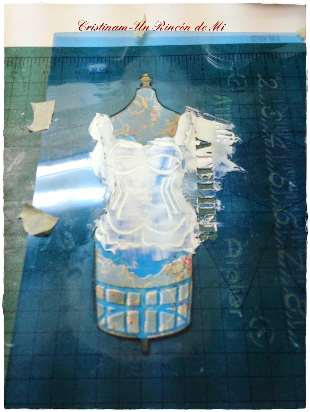 En esta entrada del blog os quiero enseñar como hago troqueles con los stencils.. en este caso he realizado el corse del maniquié vintage azul.