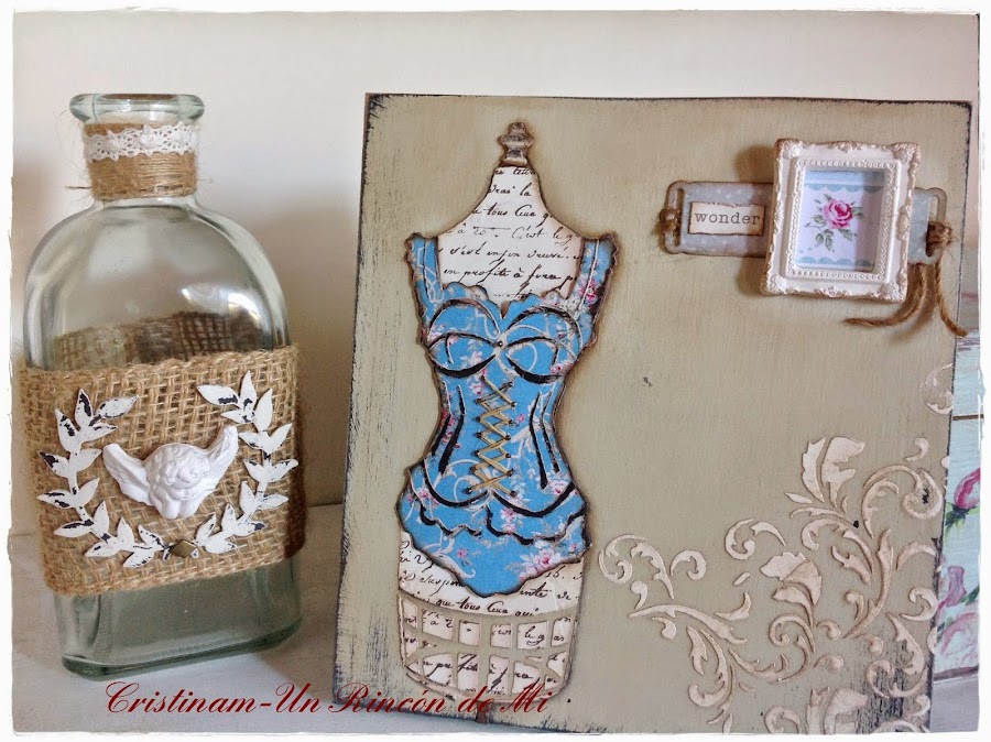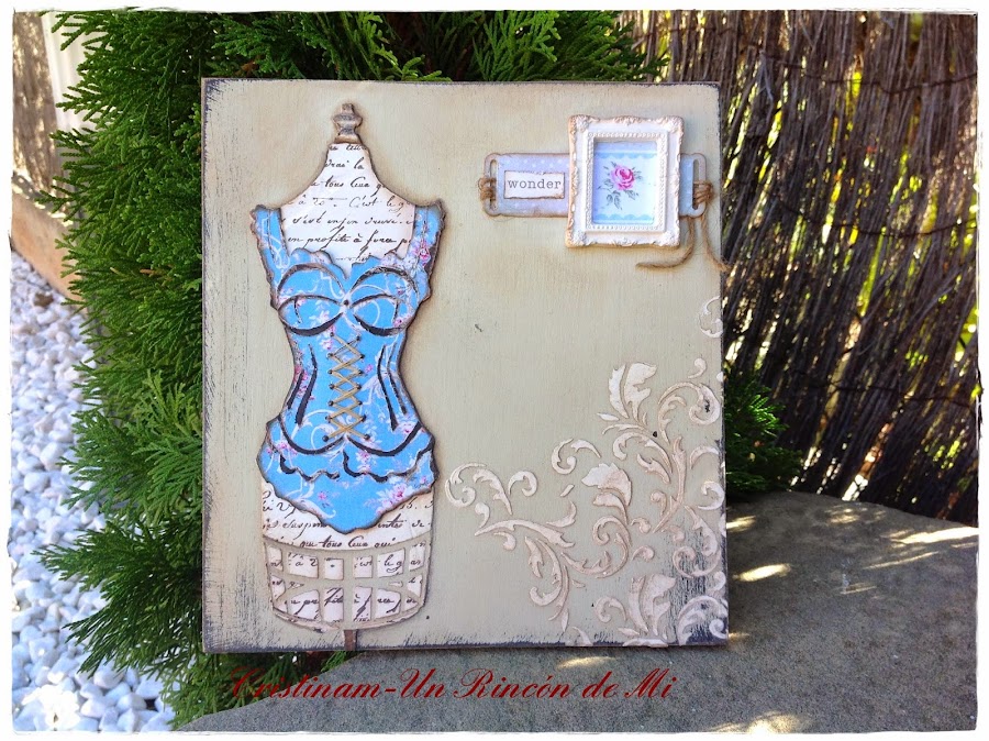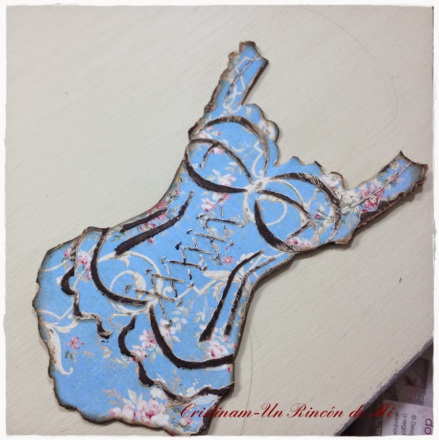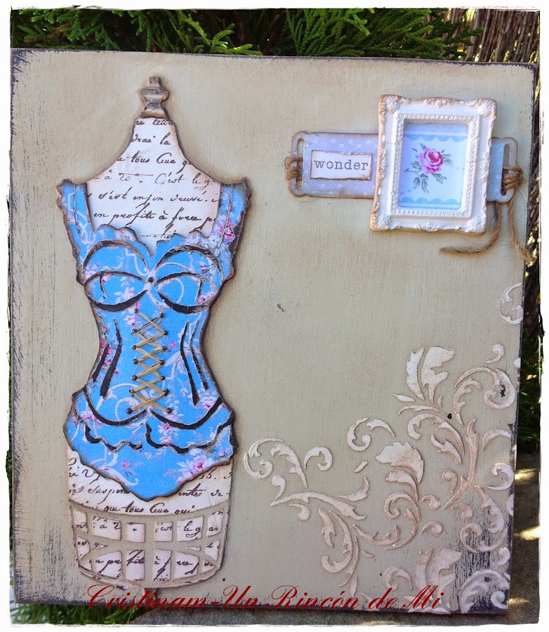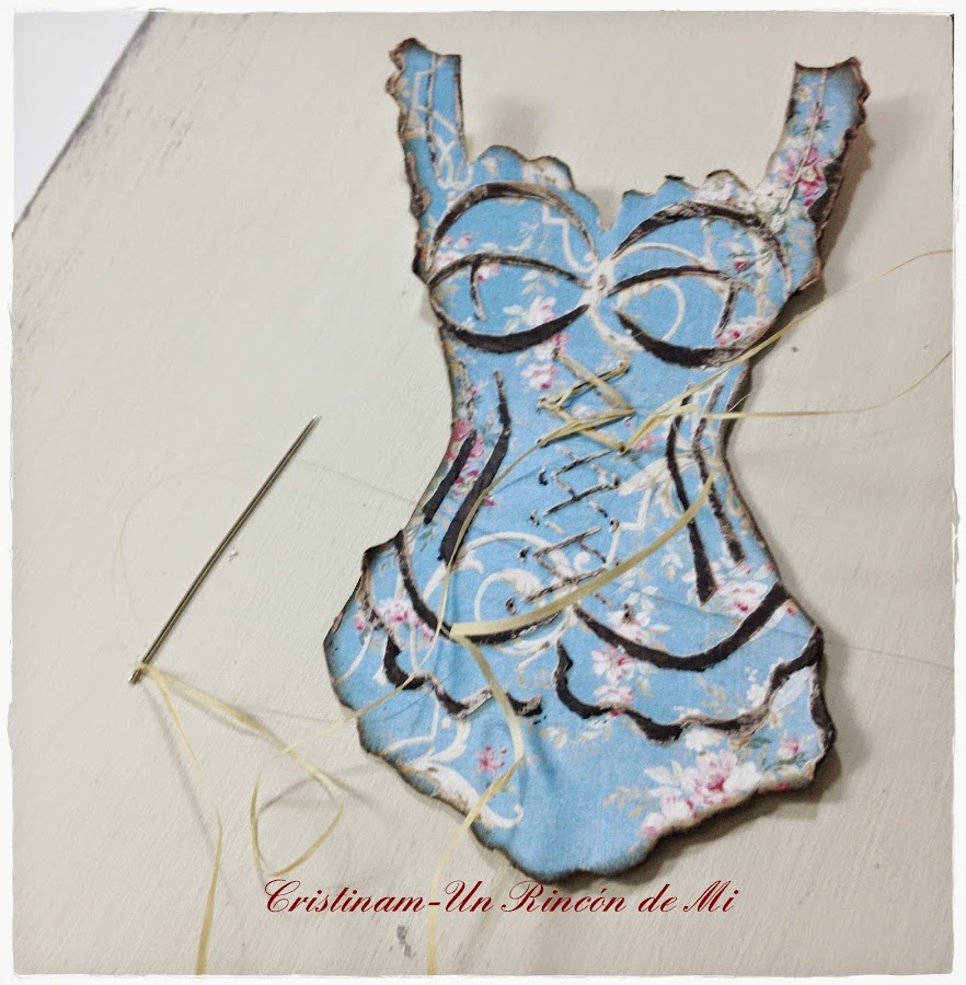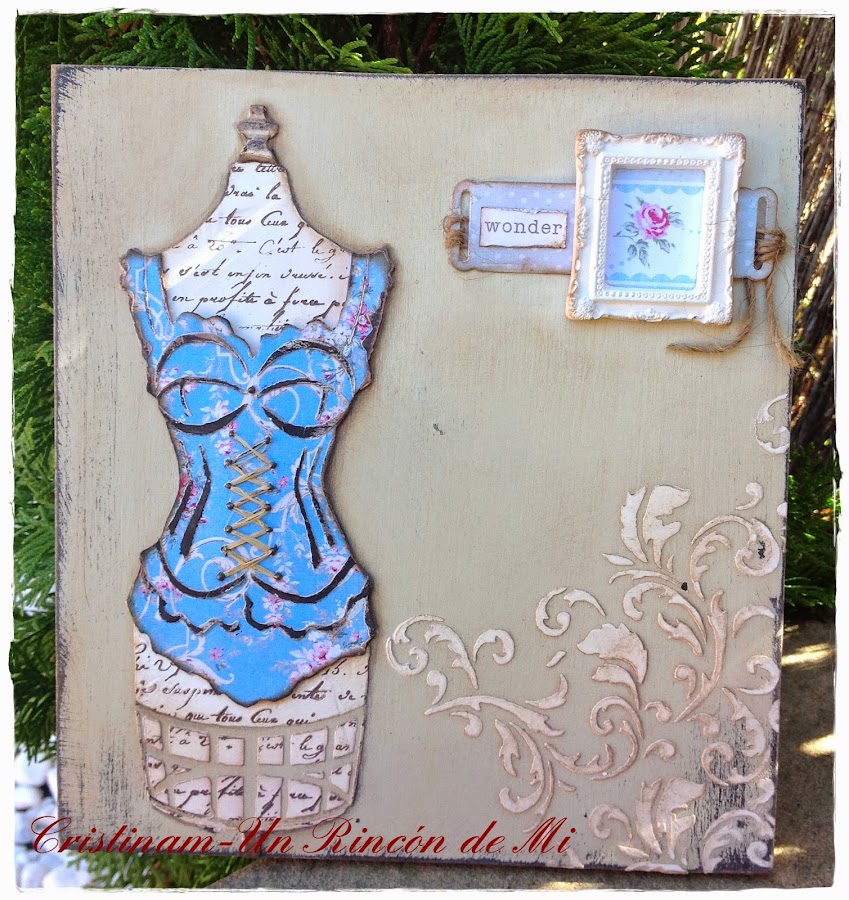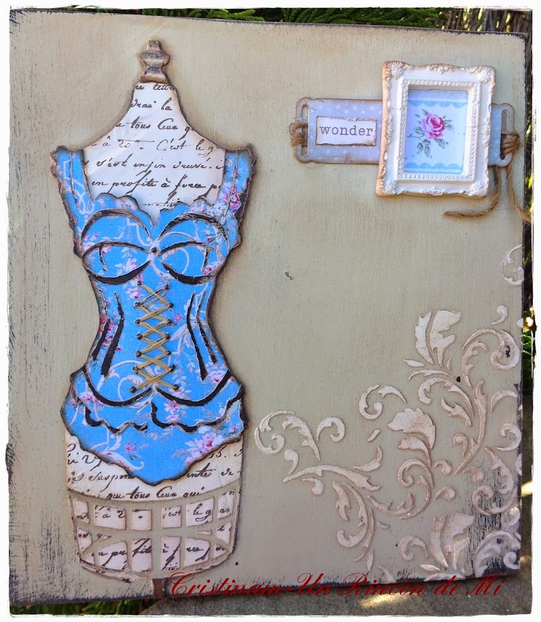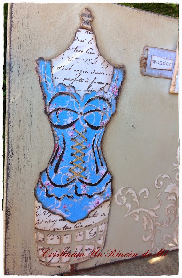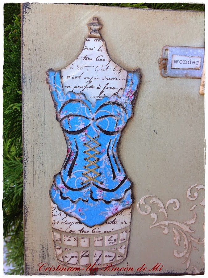 En esta entrada del blog os quiero enseñar como hago troqueles con los stencils.. en este caso he realizado el corse del maniquié vintage azul.