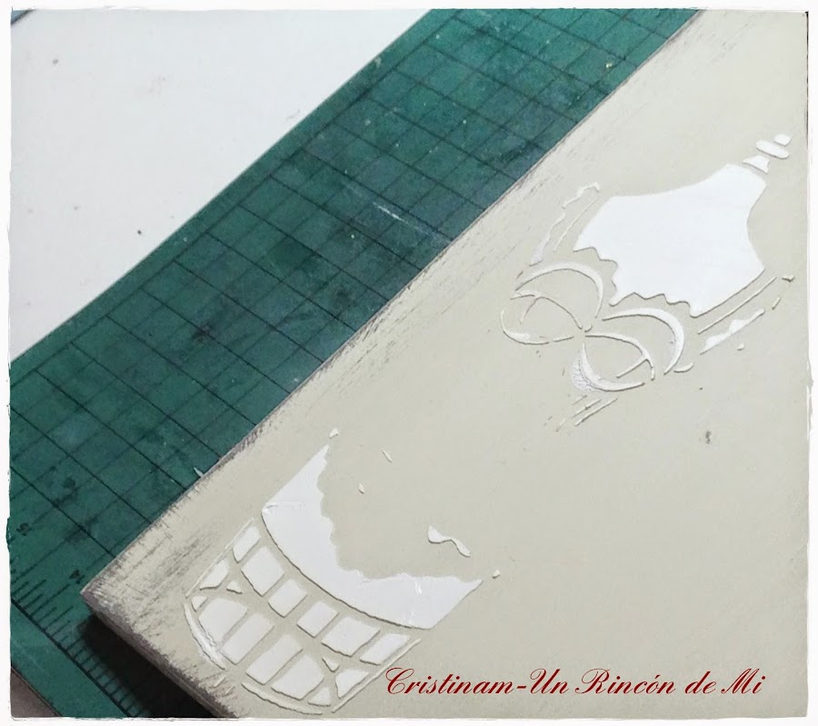 He pegado el troquel corsé y he realizado otro Stencil con pasta de stucco en un lateral de la pieza...