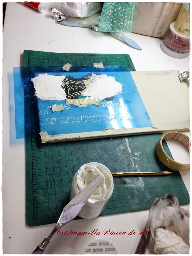 Vuelta a la tabla pintada.. he puesto el Stencil con pasta de stucco.