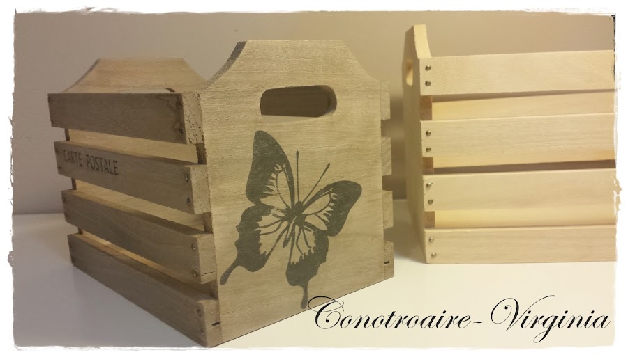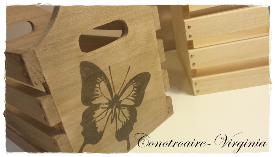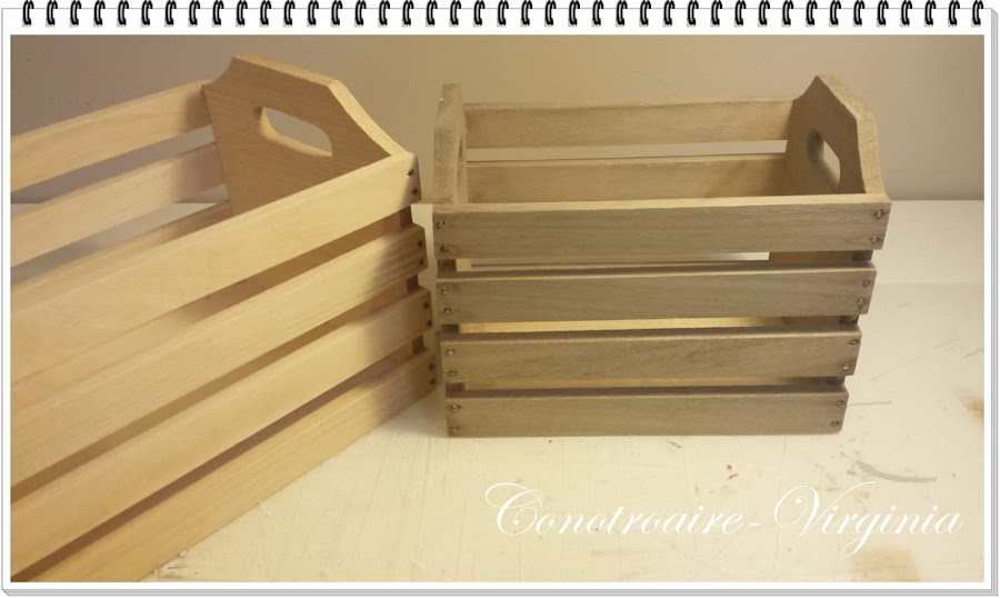 Después de las pruebas, me puse con estas cajas imitación a las de fruta que no se como no han envejecido solas con los años que llevan en el armario, ja,ja,ja,ja..... primero he probado con la pequeña, le he dado dos veces con la mezcla, dejando secar muy bien entre una y otra, y queda muy bonita, puede que en la foto no se aprecie bien, porque hoy las he hecho con el movíl y me quedan un poco amarillentas.