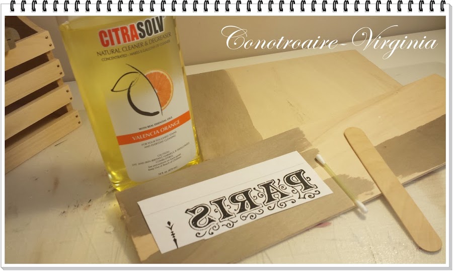Queda un efecto muy bonito. Para decorarlas pensé que le iría de maravilla unas transferencias, así que también probé antes en una madera por si acaso el Citra-solv reaccionaba con el vinagre y dejaba mancha.
