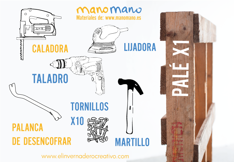 Para hacer nuestro perchero vamos a necesitar, como no, un palé ( y medio). Uno entero para la jardinera y un trocito de otro para el perchero. Una palanca de desencofrar, una caladora pendular, un taladro y un metro. Si te falta alguna de ellas y eres aficionado al DIY deberías conocer ya mismo ManoMano.es, un marketplace de bricolaje donde encontrar las mejores marcas y los mejores precios del mercado. ¿Ya lo tienes todo listo?