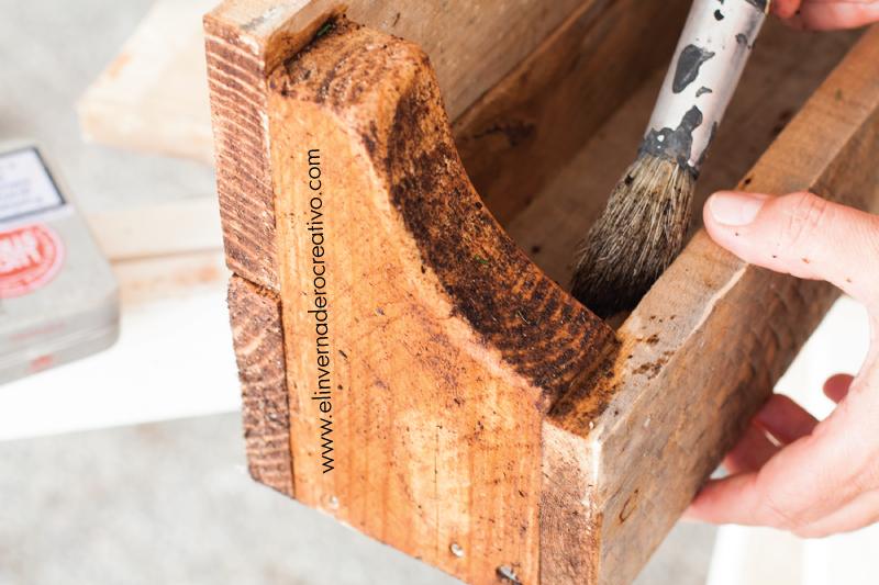 Tanto al lijar como con los cortes anteriores notaréis como se aclara la madera dejando al descubierto el veteado limpio, para devolverle su aspecto original utilizaremos una mezcla de café y tierra. Una vez mezclado a partes iguales en un recipiente, aplícalo con un pincel sobre la zona lijada y déjalo secar, conseguirás de nuevo un aspecto rústico.