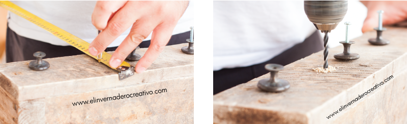 Casi hemos terminado. La estructura de madera ya está lista, ahora vamos a añadirle los colgadores. En esta ocasión hemos reutilizado varios tiradores de puerta viejos que teníamos en casa, en concreto, hemos situado tres de ellos en la parte superior para colgar las llaves y dos en la parte inferior para colgar la chaqueta, el bolso o lo que quieras. Toma medidas para situarlos justo en medio con una distancia equitativa entre ellos. La colocación de cada uno dependerá del colgador que hayáis elegido.