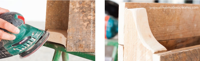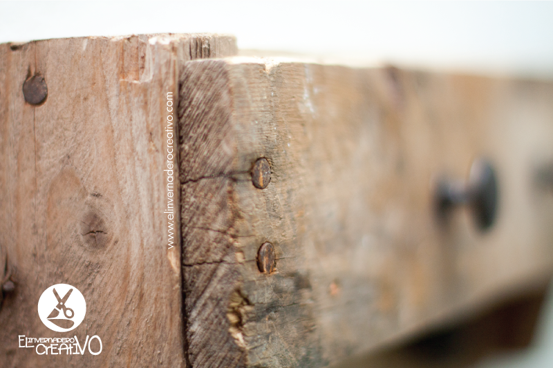 Una vez bien clavado todo vamos a ir rematando el perchero. Pasamos al lijado, pero ojo, queremos que mantenga ese aspecto rustico que caracteriza a la madera de palé y perdería su esencia si lo lijáramos entero. Tan sólo vamos a perfilar un poco los bordes astillados para que sea seguro de usar y no corramos el riesgo de clavarnos una astilla cuando colguemos nuestra ropa.