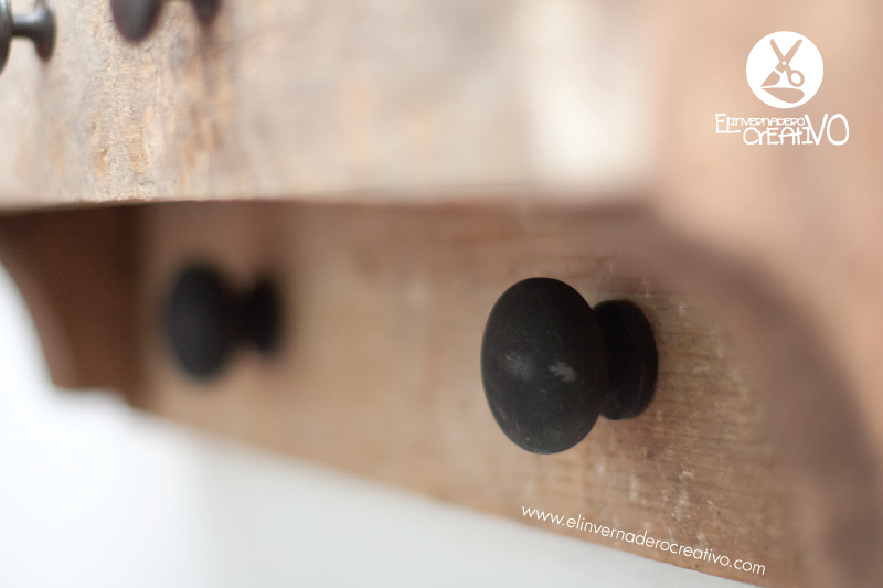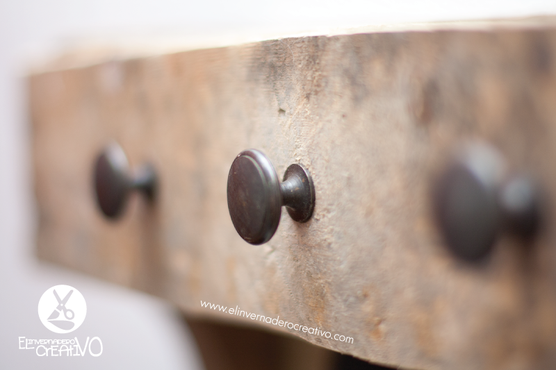Para complementar nuestro perchero hemos añadido como colgadores un par de viejos tiradores de puertas que andaban dando vueltas por casa, los remates y decoración los dejo a vuestra elección nosotros te enseñamos los pasos.